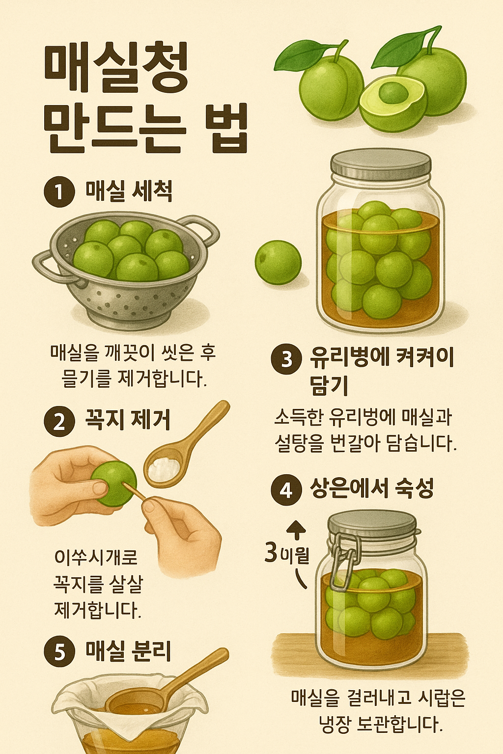 - 적당한 매실: 껍질에 상처가 없고 단단하며, 완전히 익기 전 초록색 청매실이 가장 적합합니다.