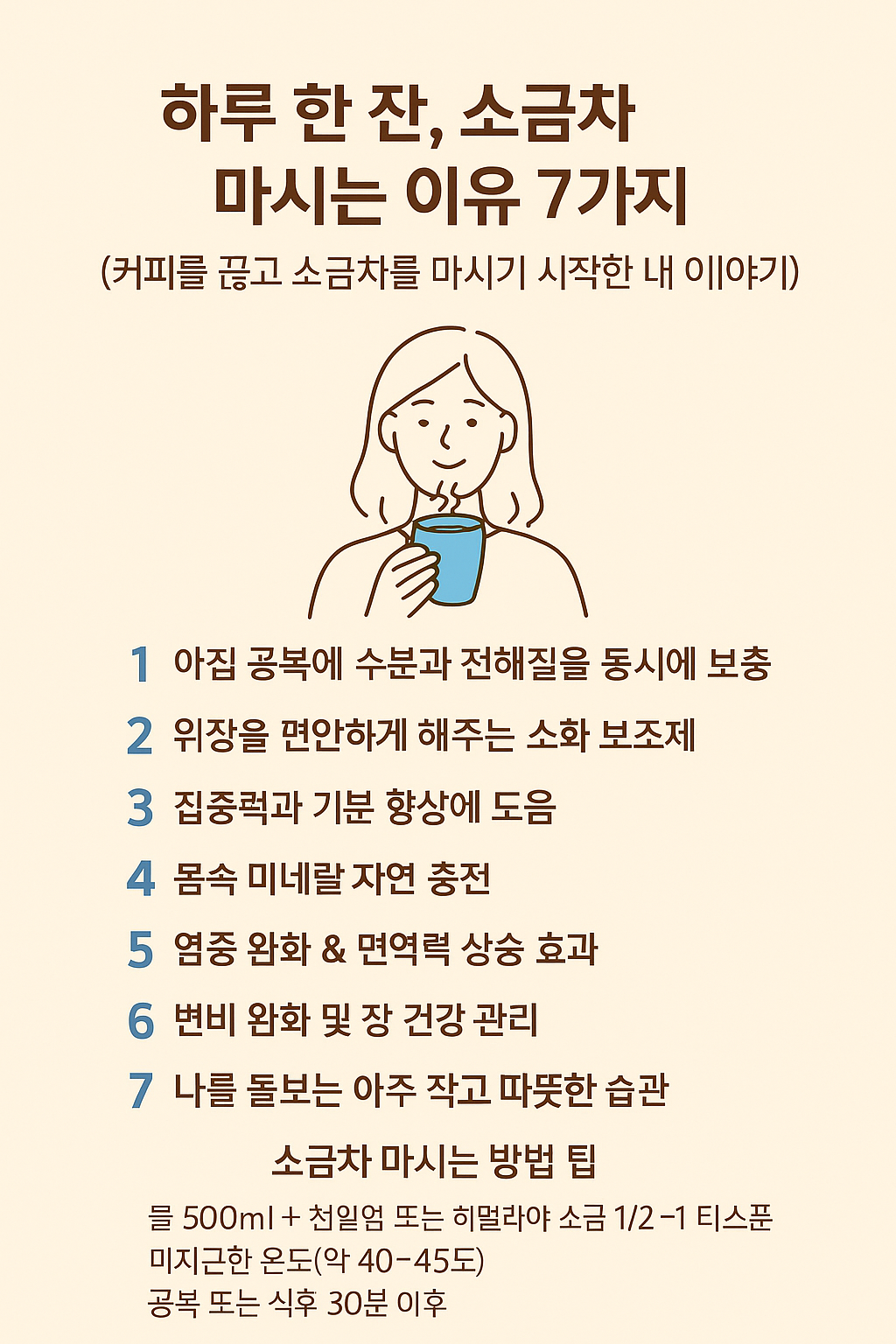 커피 대신 소금차를 선택하는 순간, 내 몸을 위한 사소하지만 큰 실천이 쌓여간다는 걸 느끼게 돼요.